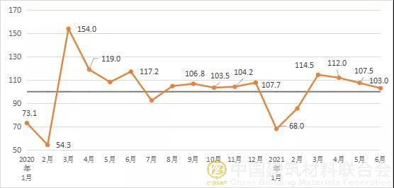 2021年6月份建筑材料工業(yè)景氣指數(shù)為103.0點(diǎn),低于上月4.5個(gè)點(diǎn),但高于臨界點(diǎn),仍處于景氣區(qū)間。