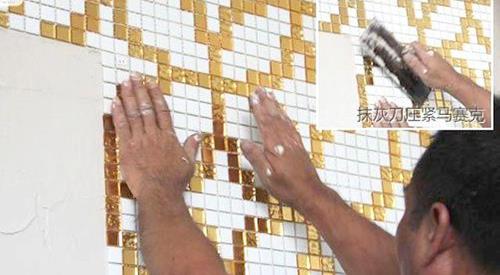 按照設(shè)計(jì)圖紙將馬賽克瓷磚依次鋪貼在做好基底上好膠的墻面,每鋪完一張瓷磚,就要讓它與膠水結(jié)合牢固??梢杂锰羁p擦拍牢或者用橡膠錘均勻敲打,保證每一張馬賽克瓷磚都能牢固結(jié)合。