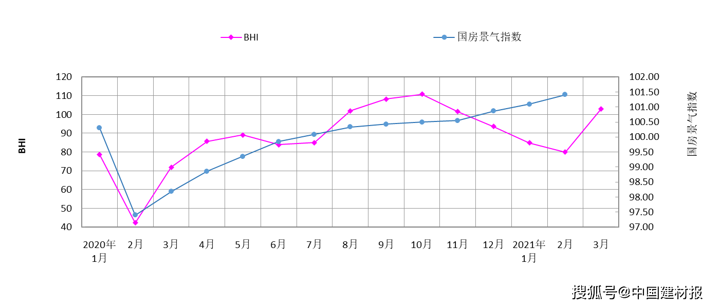圖1:2020年1月至2021年3月BHI與國(guó)房景氣指數(shù)對(duì)比圖